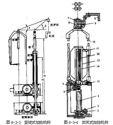 這種加捻機(jī)構(gòu)的錠翼雙臂封閉,頂部和底部均有軸承支承,其傳動有兩種形式,一種是錠翼的傳動軸在錠翼的上方,另一種錠翼的傳動軸在錠翼的下方,如圖6-3-4所示。在圖(1)中,錠翼10由上部錠翼罩殼7內(nèi)的螺旋齒輪6和轉(zhuǎn)動軸9傳動。壓掌11位于空心臂的中部。導(dǎo)向軸1和錠套筒14分別由螺旋齒輪2和5傳動。錠套筒14外套紗管13,內(nèi)側(cè)通過雙鍵12與錠子相連,并帶動錠子同向回轉(zhuǎn)。錠子為空心,其頂部緊固一塑料六角形正齒輪以支承筒管,使其隨錠子一起運(yùn)動。錠子下部內(nèi)壁有螺紋與導(dǎo)向軸的螺紋相吻合,當(dāng)導(dǎo)向軸與錠子間同向等速轉(zhuǎn)動時(shí),錠子無升降運(yùn)動,若導(dǎo)向軸轉(zhuǎn)速快,則錠子向上運(yùn)動,若導(dǎo)向軸轉(zhuǎn)速慢,則錠子向下運(yùn)動,從而達(dá)到紗管升降卷繞的目的。