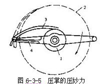 ⒉壓掌壓紗力  為了使粗紗在卷繞過程中壓掌葉3始終壓向粗紗管1,壓掌桿的離心力矩總是大于壓掌葉的離心力矩。依靠兩者對空心臂4的力矩差,壓掌葉將粗紗壓向紗管,使粗紗緊密地繞在筒管上。卷繞過程中,隨著粗紗卷繞直徑2的逐層增加,壓掌葉的離心力也逐漸增大,壓掌桿的離心力逐層減小,故壓掌葉對紗管的壓力隨卷繞直徑的增加而減小,如圖6-3-5所示。壓掌壓紗力的這種變化,使內(nèi)外層粗紗直徑被壓扁的程度不一致,內(nèi)層的壓扁程度較外層的大,這樣可避免在卷繞外層粗紗時(shí)因壓掌壓力過大而將內(nèi)層粗紗向卷裝兩端擠出的疵病,但壓紗力的變化將影響卷繞張力。