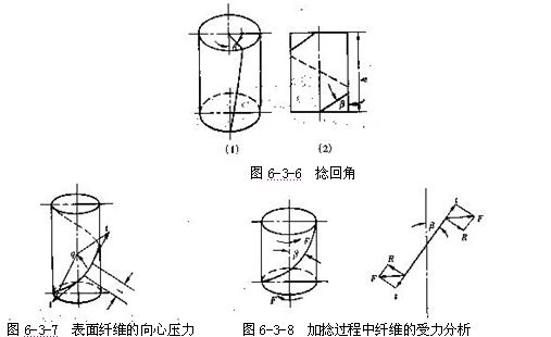 (三)捻回角  粗紗加捻前纖維的排列基本上平行于紗條的軸線,加捻后在加捻力矩的作用下,紗條橫斷面間產(chǎn)生角位移,使原來平行于紗軸的纖維傾斜成螺旋線,紗的表面纖維對紗軸的傾角β稱為捻回角,如圖6-3-6所示。取紗條表面一小段纖維l進(jìn)行分析,如圖6-3-7所示,纖維兩端張力t的合力q,形成向心壓力,使外層纖維向內(nèi)層擠壓,縮小了紗條的直徑,增加了紗條緊密度和纖維間的摩擦力,從而增強(qiáng)了紗條的強(qiáng)力。如不考慮螺旋線曲率半徑對向心壓力q的影響,加捻時(shí)纖維所受的張力越大,向心壓力越大。纖維所受張力的大小,與捻回角的大小有關(guān)。如圖6-3-8所示,加捻力矩施加于紗條表面的力F可分解為互相垂直的兩個(gè)分力t與R,t為沿著纖維軸線的張力,R為垂直于纖維軸線,使纖維傾斜的力,則t=Fsinβ。因?yàn)棣陆切∮讦?2,所以在一定的加捻力矩下,捻回角愈大,纖維所受的張力越大,產(chǎn)生的向心壓力也越大,紡出紗條的結(jié)構(gòu)越緊密。因此捻回角的大小,反映了紗條的加捻程度。