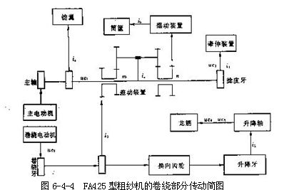 (一)粗紗機卷繞傳動系統(tǒng)的發(fā)展  國產(chǎn)粗紗機的發(fā)展主要體現(xiàn)在對卷繞傳動系統(tǒng)的改進上。過去粗紗機的卷繞傳動系統(tǒng)由機械式變速裝置、差動裝置、升降裝置、擺動裝置及成形裝置等組成,各機構間的內在聯(lián)系見圖6-4-3所示。其代表機型有A456、FA401、FA423、EJ521等。