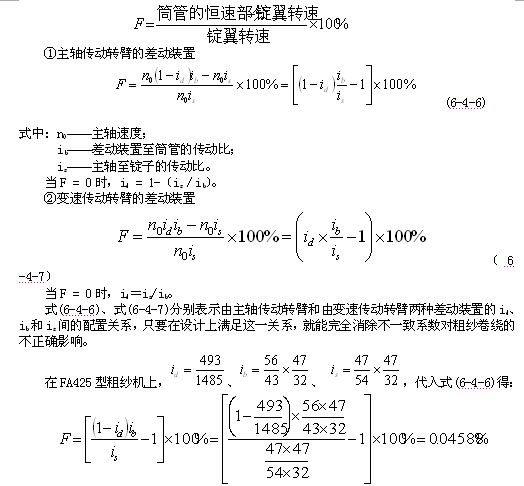 (2)差動裝置不一致系數(shù)的計算  由式(6-4-5)可知,筒管的速度由恒速部分和變速部分組成,恒速部分等于錠速,變速部分是卷繞速度,其變化規(guī)律和管紗的卷繞直徑成反比。如果筒管的恒速和錠速不等,其差值就要加入到卷繞速度中去。隨著卷繞速度逐層減慢,這個差值在卷繞速度中占的比例逐層增大,從而破壞了卷繞規(guī)律,引起卷繞張力的變化,增加了粗紗長片段不勻。筒管的恒速與錠速之差對錠速比值的百分率,稱為不一致系數(shù)F。當F=0時,說明卷繞規(guī)律正常;當F≠0時,則F的絕對值越大,卷繞規(guī)律的破壞越嚴重。兩類差動裝置不一致系數(shù)F的計算公式如下: