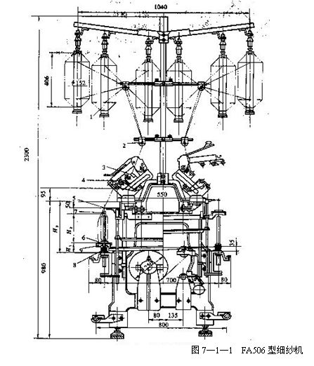 圖7—1—1為FA506型細(xì)紗機(jī)的示意圖,粗紗自吊錠上的粗紗管1退繞后,經(jīng)導(dǎo)紗桿2、緩慢往復(fù)運(yùn)動(dòng)的橫動(dòng)導(dǎo)紗喇叭3,喂入牽伸裝置4,牽伸后的須條由前羅拉輸出,經(jīng)過導(dǎo)紗鉤5,穿過鋼絲圈6,卷繞到緊套在錠子8上的筒管7上,鋼絲圈每轉(zhuǎn)一轉(zhuǎn),給須條加上一個(gè)捻回。鋼絲圈的轉(zhuǎn)速低于紗管的轉(zhuǎn)速,依靠鋼領(lǐng)板9的升降運(yùn)動(dòng),使前羅拉輸出的須條按一定的成形要求有規(guī)律地卷繞到紗管上。
