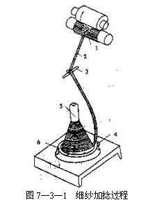 細(xì)紗加捻過(guò)程如圖7—3—1所示。前羅拉1輸出的紗條2經(jīng)導(dǎo)紗鉤3,穿過(guò)鋼領(lǐng)6上的鋼絲圈4,繞到緊套于錠子的筒管5上。錠子回轉(zhuǎn)時(shí),借助紗線(xiàn)張力的牽動(dòng),使鋼絲圈沿鋼領(lǐng)回轉(zhuǎn),鋼絲圈帶動(dòng)紗條沿鋼領(lǐng)回轉(zhuǎn)一轉(zhuǎn)紗條就獲得一個(gè)捻回。