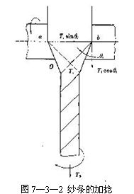 紗條的加捻,其實(shí)質(zhì)就是利用須條橫截面間產(chǎn)生相對(duì)角位移,使原來(lái)伸直平行的纖維與紗軸發(fā)生傾斜來(lái)改變須條結(jié)構(gòu)。紗條由扁平狀形成近似的圓柱形。如圖7—3—2所示,前羅拉輸出的須條呈扁平的狀態(tài),纖維與紗軸平行排列。鋼絲圈回轉(zhuǎn)產(chǎn)生的捻回向前羅拉鉗口傳遞,使鉗口處的須條圍繞軸線(xiàn)回轉(zhuǎn),須條寬度逐漸收縮,兩側(cè)也逐漸折疊而卷入紗條中心,形成加捻三角區(qū)。在加捻三角區(qū)中,須條的寬度和截面發(fā)生變化,從扁平狀逐漸形成近似圓柱形的細(xì)紗。