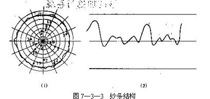 須條加捻時(shí),產(chǎn)生了纖維的內(nèi)外層轉(zhuǎn)移。如圖7—3—2所示,設(shè)紗條截面上纖維根數(shù)為n,各根纖維與紗條輸出軸向的夾角為θi,在紡紗張力TS作用下,每根纖維受到張力Tisinθi,其軸向按平衡條件有  ∑Ticosθi=TS,其徑向產(chǎn)生向心壓力為T(mén)isinθi,邊纖維θi大,Tisinθi大,中心纖維θi接近于0,Tisinθi接近于0。因此,從加捻三角區(qū)中纖維的幾何位置和紡紗張力所產(chǎn)生的力學(xué)條件迫使邊纖維擠向中心,把中心纖維擠向外緣。當(dāng)邊緣纖維擠入中心后,其向心壓力趨于零,又被另一些外緣纖維擠出來(lái),一根纖維往往從外向內(nèi),又從內(nèi)到外,發(fā)生內(nèi)外層纖維反復(fù)轉(zhuǎn)移,因此,紗條中纖維的實(shí)際幾何形狀如圖7—3—3所示。圖(1)是紗條中一根纖維相隔0.2mm切片上各點(diǎn)橫截面投影。
