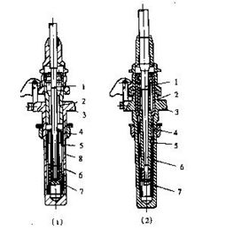 (1)分離式錠膽:如圖7—3—4(1)所示,上支承2由上軸承連同軸承座壓配在錠腳3中,錠底7裝配在中心套管5中,借彈性元件組合裝配在錠腳3內(nèi)。下支撐由中心套管5、彈性圈4、隔離圈8、圈簧6組成,安裝在錠腳3中。彈性圈的內(nèi)圈與中心套管緊密配合,外圈與錠腳保持較小間隙,起確定錠子中心和下支撐的橫向、縱向支撐作用。圈簧由彈簧鋼皮卷成,當(dāng)錠桿振動(dòng)使下支撐偏離時(shí)能自調(diào)中心,同時(shí)利用各圈簧之間形成的多層油膜的粘性阻尼起到吸振作用。目前廣泛使用的這類(lèi)錠子是D1200系列高速錠子,F(xiàn)A506型細(xì)紗機(jī)可配用該系列錠子。