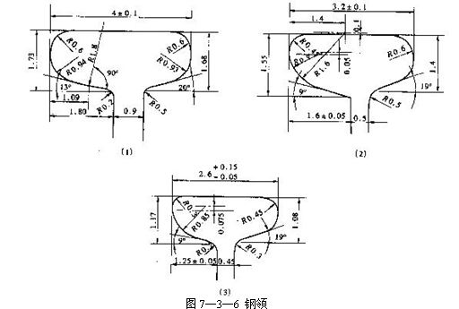 根據(jù)不同的紡紗要求,平面鋼領(lǐng)主要有三種,紡超細(xì)特紗和細(xì)特紗常用高速平面鋼領(lǐng)PGl/2型(邊寬2.6mm),其跑道由雙曲率半徑構(gòu)成,抗楔性能好,適應(yīng)高速;紡細(xì)特、中特紗常用高速平面鋼領(lǐng)PGl型(邊寬3.2mm),其跑道由多曲率半徑構(gòu)成,抗楔性能好;紡粗特紗用普通平面鋼領(lǐng)PG2型(邊寬4mm),其邊寬較寬,使用壽命較長(zhǎng)。圖7—3—6為這三種平面鋼領(lǐng)的截面幾何形狀,圖(1)為PG2型鋼領(lǐng),圖(2)為PGl型鋼領(lǐng),圖(3)為PGl/2型鋼領(lǐng)。