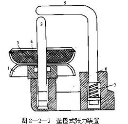 墊圈式張力裝置如圖8—2—2所示,由兩片圓盤形張力盤1和芯軸2所組成,在上張力盤內(nèi)裝有毛氈墊圈3和張力墊圈4。紗線在上下兩片張力盤之間通過時,由于張力盤與紗線的摩擦作用,上張力盤及張力墊圈隨著紗線的前進而回轉(zhuǎn),紗線上落下的塵屑被拋出,同時由于摩擦阻力而使紗線具有一定的張力。毛氈墊圈的作用是吸收上張力盤和張力墊圈在高速轉(zhuǎn)動時的震動,使紗線張力均勻,從而得到良好的成形。