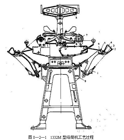 1332型槽筒式絡(luò)筒機的工藝過程如圖8—2—1所示。紗線自管紗(線)1退繞下來,經(jīng)導(dǎo)紗桿2引入導(dǎo)紗板凳,再經(jīng)過圓盤張力器和清紗板5的縫隙以及張力桿6引入槽筒7的溝槽。由于槽筒摩擦傳動筒子回轉(zhuǎn)和溝槽的往復(fù)導(dǎo)紗運動,從而使紗線交叉地卷繞在筒子上。