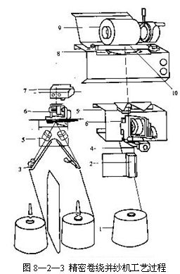 (一).精密卷繞并紗機的工藝流程  圖8—2—3為精密卷繞并紗機工藝過程,喂人單紗筒子1放在擱架上,在紗筒之間有隔紗器。紗線由筒子退繞后,經(jīng)過氣圈控制器2、導(dǎo)紗器3,穿過機械式預(yù)清紗器4、紗線張力裝置6、斷頭探測器5、切紗與夾紗裝置7,由支撐羅拉10支撐,并由導(dǎo)紗裝置8導(dǎo)向卷繞成精密筒子9。