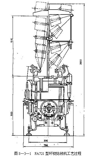 圖8—3—1是國(guó)產(chǎn)FA721—75型環(huán)錠捻線(xiàn)機(jī),本機(jī)有純捻和并捻聯(lián)合兩種紗架可供選擇。左邊喂入并紗筒子可進(jìn)行純捻捻線(xiàn);右邊喂人圓錐形單紗筒子,可作為并捻聯(lián)合使用,F(xiàn)以右面為例,從圓錐形筒子引出的紗,通過(guò)導(dǎo)紗桿,在導(dǎo)紗器處并紗后,經(jīng)上下羅拉鉗口,繞過(guò)上羅拉引出,通過(guò)斷頭自停裝置,穿過(guò)導(dǎo)紗鉤,繞過(guò)鋼領(lǐng)上回轉(zhuǎn)的鋼絲圈,最后卷繞在管紗上。