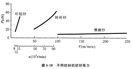 (2)低張力紡紗。摩擦紡的紡紗速度為環(huán)錠紡的10—25倍,轉(zhuǎn)杯紡的2.5倍,但紡紗張力只有環(huán)錠紡的20%,轉(zhuǎn)杯紡的14%,如圖6—18所示,這導(dǎo)致纖維在紡紗過(guò)程中內(nèi)外轉(zhuǎn)移困難,纖維伸直少,毛羽多。