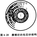 摩擦紡還能紡包芯紗,用長(zhǎng)絲或短纖紡制的紗作芯紗,垂直喂入的纖維分層次被搓捻在芯紗上,形成有特色的包芯紗,如圖6—20所示。