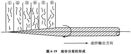 摩擦紡紗過(guò)程中,纖維以垂直于成紗輸出方向并沿塵籠楔形凝聚區(qū)逐漸添加并捻人錐形紗尾上,使摩擦紗形成從紗芯到外層逐層包覆的分層結(jié)構(gòu)。圖6—19所示為6根條子并排喂入時(shí),成紗在組份成份上形成分層結(jié)構(gòu)的情況。