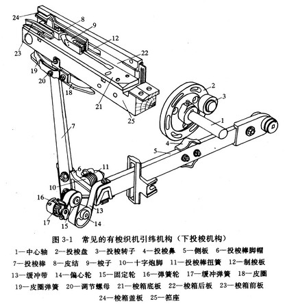 常見的引緯機(jī)構(gòu)(投梭機(jī)構(gòu))有三種。根據(jù)傳遞投梭棒運(yùn)動(dòng)的作用力位置的高低分上投梭、中投梭、下投梭。