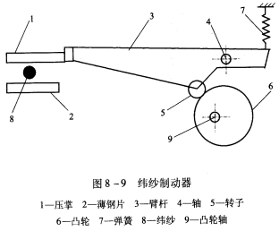 緯紗制動器的結(jié)構(gòu)示意圖如圖8—9所示,它由瓷質(zhì)的壓掌1與一片厚度為0.04~0.07mm的拋光薄鋼片2組成,緯紗8在壓掌與薄鋼片2之間通過。根據(jù)壓掌1對薄鋼片2的壓緊程度,使紗線在壓掌表面與薄鋼片之間產(chǎn)生不同的摩擦力。壓掌1固裝在臂桿3上,臂桿以軸4為擺動中心,它的下臂端裝有轉(zhuǎn)子5,依靠彈簧7的作用使轉(zhuǎn)子與裝在凸輪軸9上的凸輪6相接觸。當凸輪回轉(zhuǎn)時,壓掌就做上下擺動,壓掌與薄鋼片的接觸程度就發(fā)生變化,從而控制對緯紗的制動作用。