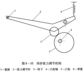 圖8—10是緯紗張力調(diào)節(jié)機構(gòu)簡圖,在張力調(diào)節(jié)桿2的頂端有瓷眼1,緯紗從瓷眼中穿過。由于彈簧6的拉力,使張力調(diào)節(jié)桿2上的轉(zhuǎn)子3與凸輪5接觸,凸輪5的回轉(zhuǎn)使張力調(diào)節(jié)桿2上下擺動。凸輪軸4與圖8—9中的凸輪軸9相同。