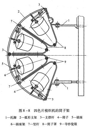 緯紗卷裝安裝在織機左側(cè)的筒子架上,俯視圖如8—8所示。筒子架的兩個托腳1與織機的左墻板連接,弧形支架2就固定在這兩個托腳上,另外三根支撐桿3垂直于地面,用以支撐弧形支架的負荷。從筒子4上退繞下來的緯紗,經(jīng)導紗瓷眼9引出,四個有機玻璃制成的筒子罩8將四列筒子分割開來,以防止紗線退繞時相互糾纏。