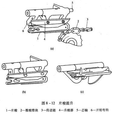 在織機的每一回轉(zhuǎn)中,都有一把片梭被提升到擊梭位置,如圖8-12(a)所示。片梭1被傳送鏈3上的推梭滑塊2從織機的制梭側(cè)返回到投梭側(cè),進人升梭器4中,升梭器以芯軸5為回轉(zhuǎn)中心。在圖8-12(b)中,開鉗彎鉤6開始深入到片梭尾部的圓孔中,準備打開片梭的鉗13,升梭器即將向上轉(zhuǎn)動,升至擊梭位置。打開梭夾的開鉗彎鉤6也裝在芯軸5上,但受另一傳動桿傳動,其繞芯軸5的轉(zhuǎn)動量大于升梭器,在升梭器回轉(zhuǎn)90°將片梭提升到擊梭位置的過程中,開鉗彎鉤深入并打開片梭的梭夾鉗口,為遞緯作準備,如圖8—12(c)所示。升梭器4和開鉗彎鉤的轉(zhuǎn)動分別由兩個圓柱凸輪傳動。