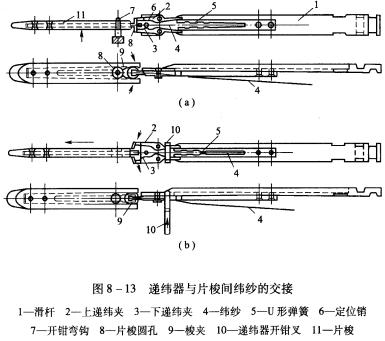 在片梭11梭器翻轉(zhuǎn)到投梭位置后,片梭的梭夾鉗口已被開鉗彎鉤7打開,遞緯器的鉗口平面與片梭的鉗口平面相互垂直,這時緯紗雖然還被遞緯器夾持,但緯紗頭已深入到片梭張開的鉗口中,如圖8—13(a)所示。在圖8—13(b)中,開鉗彎鉤已從片梭的圓孔8中退出,梭夾9閉合,其鉗口夾持住緯紗頭。遞緯器開鉗叉10作用于遞緯器的上、下遞緯夾末端,使遞緯器的鉗口張開,此時緯紗只被片梭的鉗口夾持,于是完成了緯紗由遞緯器向片梭的轉(zhuǎn)移。