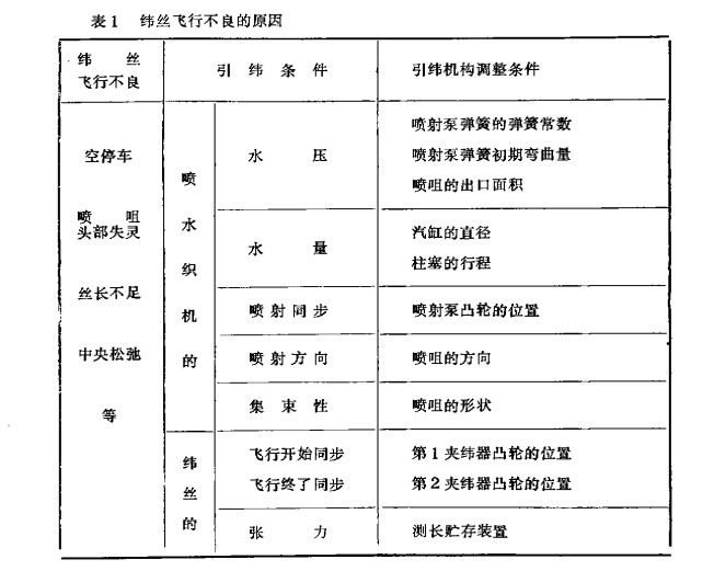 噴水織機(jī)是依靠水噴射使緯絲飛行的。這個(gè)時(shí)候必須賦予緯絲以正確同步,且充分的飛行力,然而,現(xiàn)在在噴水織機(jī)的停臺(tái)原因中,緯絲飛行不良卻占了6O以上。