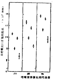 圖1所示在雙噴踞兩緯換噴的織機(jī)上(幅~150cm,車速42O轉(zhuǎn)/分),噴射泵彈簧的初彎曲量在三個(gè)階段里變化的情況下,從噴咀里噴射出的水速為34.8米/紗時(shí),測(cè)出的緯絲頭部位置的結(jié)果。圖中縱座標(biāo)表示離開噴咀頭部的距離。在各個(gè)初期彎曲量中,4個(gè)“0符號(hào)
