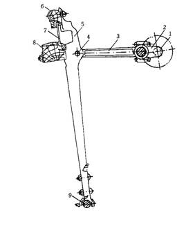 1-織機(jī)主軸? 2-曲柄? 3-連桿? 4-牽手栓? 5-筘座腳? 6-筘帽? 7-鋼筘? 8-筘座? 9-搖軸