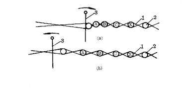 在打緯開始以后,打緯作用波及織口,隨著鋼筘繼續(xù)向機前方向移動,織口將被推向前方,同時新緯紗在鋼筘的打擊下,將壓力傳給相鄰的緯紗。如圖9-8(a)所示,使織口處原第一根緯紗A向第二根緯紗B靠近,而第二根又向第三根緯紗C靠近,如此等等,相對于經(jīng)紗略做移動。與此同時,經(jīng)緯紗線間產(chǎn)生急劇的摩擦和屈曲作用,當鋼筘到達最前方位置時,這些作用最為劇烈,因而產(chǎn)生最大的阻力,這個最大的阻力稱為打緯阻力。此刻,鋼筘對緯紗的作用力也達到最大,稱為打緯力。打緯力與打緯阻力是一對作用力與反作用力。