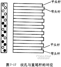 紋板的結(jié)構(gòu)如圖7-17所示,每塊紋板上有兩列紋釘孔,呈錯開排列,第一、二列紋孔分別對準(zhǔn)彎頭重尾桿和平頭重尾桿。每列紋孔控制一次開口,紋板的紋孔列數(shù)應(yīng)為組織循環(huán)緯紗數(shù)的整數(shù)倍,如果組織循環(huán)緯紗數(shù)為奇數(shù),則應(yīng)乘上一個偶數(shù),以得到整數(shù)塊紋板。此外,因為花筒是八角形的,紋板的總數(shù)應(yīng)不小于8塊(16緯)。