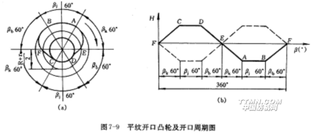 圖7-9(a)是平紋凸輪,它的外緣輪廓由若干段弧線所圍成,這些弧線分別對應(yīng)開口、靜止和閉合三個階段。其中大半徑圓弧線AB和小半徑圓弧線CD對應(yīng)綜框(經(jīng)紗)在下方和上方形成開口過程中的靜止階段,稱為靜止弧線;連接大、小半徑圓弧的弧線AD和BC使綜框(經(jīng)紗)由上方位置過渡到下方位置和由下方位置過渡到上方位置,前者稱下降弧線,后者稱上升弧線。在下降弧線和上升弧線上必有兩點E和F,在這里,運動綜框上下平齊,處于綜平位置。這就表明,凸輪每一回轉(zhuǎn),受它控制的一組經(jīng)紗便依次經(jīng)歷上方靜止(CD弧線)、閉合(DE弧線)、綜平(E)、開口(EA弧線)、下方靜上(AB弧線)、閉合(BF弧線)、綜平(F)、開口(FC弧線)、又回到上方靜止的變化,完成兩次開口動作。用開口周期圖表示,如圖7-9(b)中的實線所示。受另一凸輪控制的另一組經(jīng)紗的運動情況如圖中的虛線所示。
