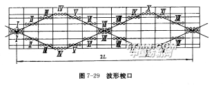 梭口沿緯向被分成m個單元,每個單元由一組綜框構(gòu)成。在織制平紋織物時,一組綜框為兩頁,它們由一對開口凸輪1、2控制。在傳動軸3上安裝控制各組綜框的凸輪時,相鄰兩對之間保持相位差α。于是織機運動過程中綜框運動構(gòu)成了如圖7-29所示的波形梭口。圖中畫出了一個基本的全波波形,它的長度為2L,它由K組運動規(guī)律相同但初相位不等的綜框形成,相鄰兩組綜框運動的相位差: