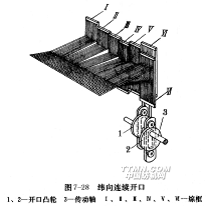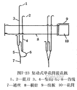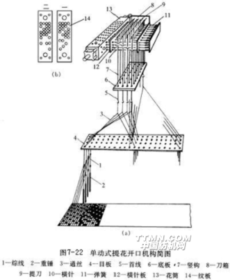 圖7-22是單動式提花開口的簡圖。所謂單動式是指提花開口機構(gòu)的刀箱8在主軸一回轉(zhuǎn)內(nèi),上、下往復(fù)運動一次,形成一次梭口。