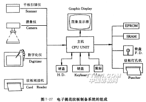 圖7-27是電子提花的花型設(shè)計和紋板制備系統(tǒng)的框圖,由圖案輸入、處理和紋板數(shù)據(jù)輸出等三部分組成。由于提花圖案較為復(fù)雜,系統(tǒng)提供了四種輸入手段。如果圖案原稿是彩圖、意匠圖和投影放大圖等紙