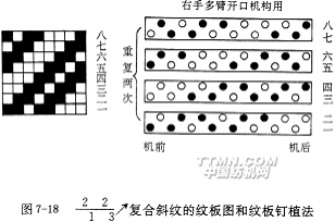 紋板制備是指根據(jù)紋板圖的要求在紋板上植紋釘?shù)牟僮?。圖7-18是復(fù)合斜紋的紋板圖和紋板釘植法。圖中黑點表示植有紋釘,圓圈表示不植紋釘?shù)目籽?。雖用四塊紋塊即可織造,但因紋板總數(shù)至少需8塊,故要重復(fù)一個緯紗循環(huán)數(shù)。