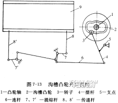 在前述的單動式和復(fù)動式單花筒多臂開口機構(gòu)中,拉刀在開始移動一段距離之后才與拉鉤接觸,于是接觸產(chǎn)生拉刀與拉鉤間的沖擊,引起動作失誤、機件磨損。為了消除這一現(xiàn)象,拉刀開始移動之前作微量的自轉(zhuǎn),在與拉鉤嚙合之后再作共同移動,這自轉(zhuǎn)是由凸輪軸兩端的溝槽凸輪來控制的。拉鉤運動結(jié)束后,溝槽凸輪通過連桿使拉刀微量倒轉(zhuǎn)以恢復(fù)原來的初始位置。