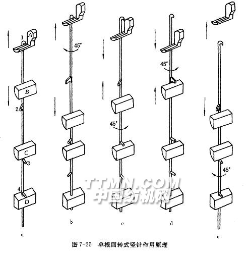 圖7-25所示為提花開口機構(gòu)的回轉(zhuǎn)豎針結(jié)構(gòu),與其它結(jié)構(gòu)的豎針相比,這種回轉(zhuǎn)豎針工作過程中不產(chǎn)生震動,承載能力較大,可以適應(yīng)高速運轉(zhuǎn)。每根回轉(zhuǎn)豎針上有4個鉤(1、2、3、4),停針鉤3與底鉤4同向,上鉤1相對底鉤4向右成45º而下鉤2則向左成45º。回轉(zhuǎn)豎針的工作過程分為五個階段。圖7-25(a)表示回轉(zhuǎn)豎針的底鉤貼在底板D上,豎針位于最低位置,經(jīng)紗位于梭口下層,上提刀A和下提刀B分別做上、下移動;圖7-25(b)表示豎針順時針方向轉(zhuǎn)過45º,上鉤1與上升的上提刀A相垂直而被提升,同時,下鉤2也同方向轉(zhuǎn)過45º而避開了下提刀B下降,此時經(jīng)紗位于梭口的上層;圖7-25(c)表示上提刀A下降,豎針逆時針方向轉(zhuǎn)過45º,停計鉤3停在停針刀C上,豎針隨上提刀略有下降;圖7-25(d)表示豎針繼續(xù)逆時針方向回轉(zhuǎn)45º,下鉤2與上升