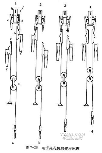 電子提花開口中廢除了機械式紋板和橫針等控制裝置,而用電磁鐵來控制首線的上下位置。圖7-26為以一根首線為提綜單元的電子提花機開口的工作原理示意圖。提刀g、f受織機主軸傳動而作速度相等、方向相反的上下往復(fù)運動,并分別帶動用繩子通過雙滑輪a連在一起的提綜鉤c、b作升降運動。如上一次開口結(jié)束時提綜鉤b在最高位置時被保持鉤d鉤住,提綜鉤c在最低位,首線在低位,相應(yīng)的經(jīng)紗形成梭口下層。此時,若織物交織規(guī)律要求首線維持低位,電磁鐵h得電,保持鉤d被吸合而脫開提綜鉤b,提綜鉤b隨提刀f下降,提刀g帶著提綜鉤c上升,相應(yīng)的經(jīng)紗仍留在梭口下層,如圖7-26(a)所示;圖7-26(b)表示提刀g帶著提綜鉤c上升到最高處,提刀f帶著提綜鉤b下到最低處,首線仍在低位;圖7-26(c)表示電磁鐵b不得電,提綜鉤c上升到最高處并被保持鉤e鉤住,提刀f帶著提綜鉤b上升,首線被提升;圖7-26(d)表示提綜鉤b被升至保持鉤d處時,電磁鐵h不得電,保持鉤d鉤住提綜鉤b,使首線升至高位,相應(yīng)的經(jīng)紗到梭口上層位置。由于提綜單元中運動件極少,由這種提綜單元組成的提花開口機構(gòu)最高可響應(yīng)1000r/min的織機轉(zhuǎn)速,這是目前最為先進(jìn)的設(shè)計。