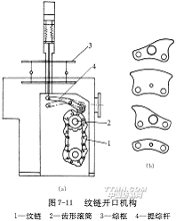 凸輪開口機構(gòu)的不足之處,其一是只能生產(chǎn)簡單組織的織物,如果織制較為復(fù)雜的織物,凸輪外形曲線將變得非常復(fù)雜,為減小壓力角,又必須將凸輪基圓直徑放大,以致開口機構(gòu)變得過分笨重;其次,一定的凸輪外形只能生產(chǎn)一定開口規(guī)律的織物品種,為了適應(yīng)織物品種多變的要求,必須儲備大量的各種開口凸輪,這在實際生產(chǎn)中是不經(jīng)濟的。事實上,凸輪外形曲線一般由小半徑到大半徑、大半徑到小半徑、大半徑到大半徑和小半徑到小半徑共四種不同弧段拼接而成。如果采用模塊化設(shè)計方法,將這四種弧段對應(yīng)的凸輪部分分列開來,單獨制造,而后將它們按織物組織的要求如同鏈條一樣串聯(lián)起來形成紋鏈,即可滿足各種復(fù)雜的開口要求。圖7-11(a)是現(xiàn)代無梭織帶機的紋鏈開口機構(gòu)的簡圖。紋鏈1由圖7-11(b)所示的四種不同形狀(弧段)的鏈塊按開口規(guī)律要求串接而成,套裝于齒形滾筒2上,主軸每一回轉(zhuǎn),滾筒轉(zhuǎn)過一塊鏈塊,驅(qū)動綜框3完成相應(yīng)的開口動作。每頁綜框?qū)?yīng)一條長度相同的紋鏈,前后頁綜框的紋鏈塊可以互換,綜框動程通過改變提綜桿4的支點位置來調(diào)節(jié)。紋鏈開口可適應(yīng)較為復(fù)雜的織物組織的織造,緯紗循環(huán)長達(dá)數(shù)十緯,最高可響應(yīng)1800r/min的織機轉(zhuǎn)速。