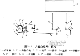 共軛凸輪開口機構(gòu)利用雙凸輪積極地控制綜框的升降運動,不需吊綜裝置。其傳動過程見圖7-12。由圖可見,凸輪2從小半徑轉(zhuǎn)至大半徑時(此時凸輪2′從大半徑轉(zhuǎn)至小半徑)推動綜框下降,凸輪2′從小半徑轉(zhuǎn)至大半徑時(此時凸輪2從大半徑轉(zhuǎn)至小半徑)推動綜框上升,兩只凸輪依次輪流工作,因此綜框的升降運動都是積極的。由于共軛凸輪裝于織機外側(cè),能充分利用空間,可以適當(dāng)加大凸輪基圓直徑和縮小凸輪大小半徑之差,達(dá)到減小凸輪壓力角的目的。此外,共軛凸輪開口機構(gòu)從擺桿一直到提綜桿都是剛性連接,因此綜框運動更為穩(wěn)定和準(zhǔn)確。