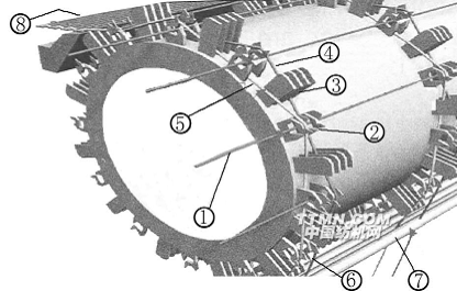 M8300型織機是Sulzer-Rüti公司研制的新一代經(jīng)向多梭口織機。如圖7-30所示,該織機在經(jīng)紗方向依次打開的梭口中,同時引入四根緯紗1(圖中畫出兩根)。經(jīng)紗6在回轉(zhuǎn)的織造轉(zhuǎn)子上面通過,借助梭口形成元件使經(jīng)紗抬起進(jìn)入上梭口位置,織造轉(zhuǎn)子(圖中未注)的弧度和旋轉(zhuǎn)使得轉(zhuǎn)子上的開口片2按順序打開梭口。在開口片插入經(jīng)紗片以前,經(jīng)紗位置由經(jīng)紗定位桿7的緯向精密移動進(jìn)行控制,被開口片抬起的那部分經(jīng)紗形成上層梭口4,其余經(jīng)紗留在原地形成下層梭口5。經(jīng)紗定位桿起到單相織機中綜絲和綜框的作用,經(jīng)紗密度和織物組織的復(fù)雜程度決定了所需經(jīng)紗定位桿的根數(shù),每根經(jīng)紗都必須單獨穿入指定經(jīng)紗定位桿的一只孔中,每根經(jīng)紗定位桿的微移動受控于織物組織的要求。目前M8300已能生產(chǎn)平紋、斜紋等標(biāo)準(zhǔn)織物組織,最大經(jīng)紗密度為450根/10cm。一旦形成一個梭口,低壓空氣就帶引緯紗穿過梭口,在此引緯過程中,后繼的緯紗開始進(jìn)入隨后的開口片之中。當(dāng)一根緯紗完全引入后,它就在進(jìn)口邊被夾住并剪斷。此后,該緯紗由緊隨在每一開口片之后的特殊打緯片3打緊。由于經(jīng)紗定位桿緊貼在織造轉(zhuǎn)子下方并與其軸向平行,操作非常方便。經(jīng)紗定位桿的質(zhì)量和動程都極其微小,所以提高運動速度尚有很大潛力。