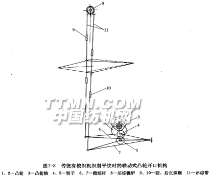 圖7-8是傳統(tǒng)有梭織機織制平紋織物時的凸輪開口機構(gòu)。綜框下降由凸輪積極驅(qū)動,綜框上升依靠兩頁綜框的關(guān)聯(lián)作用。此時,對應(yīng)的凸輪對上升綜框只起約束作用,因此這是消極式凸輪開口機構(gòu)。這種開口凸輪習(xí)慣上稱為踏盤。圖中凸輪1和2以180°相位差聯(lián)結(jié)在一起,并固裝在織機的凸輪軸又稱中心軸3上。凸輪軸每一回轉(zhuǎn),就通過轉(zhuǎn)子4、5使兩根踏綜桿6、7按相反的方向上下擺動一次,由吊綜轆轤8連在一起的前、后頁綜框9、10作一次升(降)、降(升)運動,形成兩次梭口。前、后綜通過吊綜帶11分別吊在轆轤的小、大直徑的圓周面上。這里,凸輪兼有帶動綜框運動、把經(jīng)紗分開形成梭口和控制綜框升降次序兩種作用。梭口的高度由凸輪的大小半徑之差以及踏綜桿作用臂的長短來決定,而綜框的運動規(guī)律則由凸輪外廓曲線形狀決定。