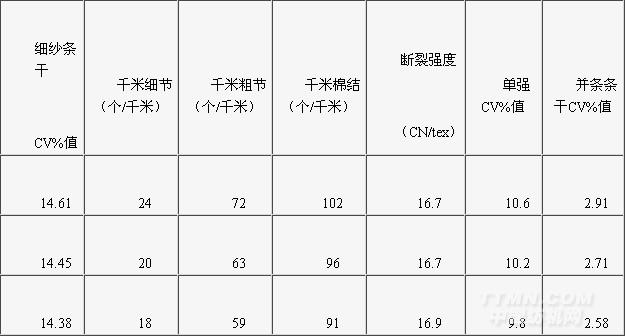 2.1成紗質(zhì)量試驗(yàn)結(jié)果見(jiàn)表2