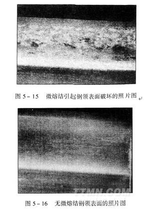 在傳統(tǒng)的鋼領表面,鋼絲圈材料中的微粒會被熔結(jié)到鋼領上,由于這個微熔結(jié)過程的存在,造成鋼領運轉(zhuǎn)軌道過早的磨損和破裂(圖5—15、圖5—16),并導致鋼絲圈運作不穩(wěn)定,紗線出現(xiàn)張力波動,使成紗質(zhì)量下降,也使鋼絲圈壽命減短。因此,設計和制造耐磨損的鋼領和鋼絲圈對緊密紡工藝而言非常重要。