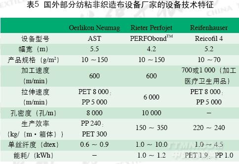 RieterPerfojet公司的PERFObondTM紡粘非織造布生產(chǎn)線可在低能耗、靈活工藝配置下生產(chǎn)出高品質(zhì)產(chǎn)品,單絲直徑10~40ìm,MD/CD接近1。在PET紡絲成網(wǎng)中,紡絲速度達5000~6000m/min,每24h斷絲最多不得超過1次。在高品質(zhì)、低能耗條件下,提高生產(chǎn)效率是人們關(guān)注的重要方面。如OerlikonNeumag公司的AST型生產(chǎn)線在紡制PET產(chǎn)品時,最多可提供3組箱體,拉伸速度8000m/min,生產(chǎn)線速度600m/min,噴絲板孔密度8000孔/m。而它提供給意大利Albis公司的紡粘非織造布生產(chǎn)線是世界上幅寬最大的紡粘生產(chǎn)線,達7m。表5是幾種具有代表性的紡粘設(shè)備的性能。