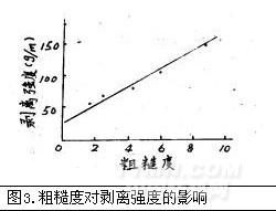 織物表面粗糙,纖維之間有毛細孔隙。熱熔膠滲透到毛細孔隙后,與織物形成機械嚙合作用,這就是機械粘合。對多數織物來講,機械粘合是形成粘合強度的主要方面。機械粘合與織物的表面粗糙有關。粘合強度與表面粗糙度關系如圖3所示:
