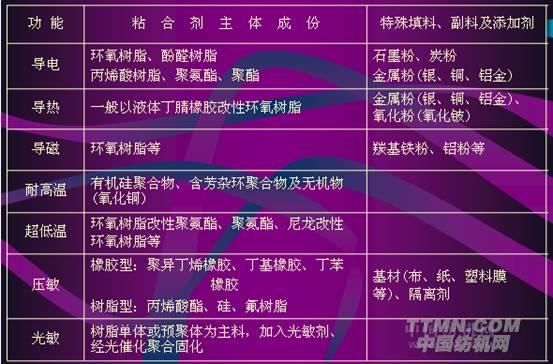 粘合劑除了具有將物與物表面之間相互粘合、物體加固的功能之外,還可以通過(guò)添加具有功能性的填料或使主體材料具有功能性,以達(dá)到壓敏、導(dǎo)電、導(dǎo)熱、導(dǎo)磁、耐高溫、超低溫等目的。