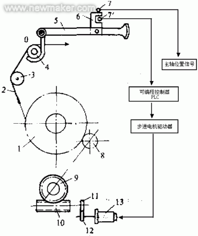 本裝置是通過檢測后梁的擺動是否超出范圍來檢測經(jīng)紗張力的波動是否滿足要求,不滿足要求時就控制送經(jīng)裝置予以調(diào)整。如圖4,當(dāng)經(jīng)紗2的張力發(fā)生波動時,活動后梁4帶動張力感應(yīng)桿5繞點O擺動。當(dāng)檢測片6進(jìn)入接近開關(guān)7的有效作用區(qū)時,接近開關(guān)7就發(fā)出一高電平信號。以PLC為核心的控制器根據(jù)這一信號和主軸位置信號,啟動步進(jìn)電機13,驅(qū)動織軸送出經(jīng)紗。接近開關(guān)7’是極限張力檢測開關(guān)。當(dāng)經(jīng)紗張力過大或過小時,檢測片6將遮擋接近開關(guān)7’,7’輸出的高電平信號到控制器后,控制器就會關(guān)掉織機,以便進(jìn)行人工處理。主軸位置的檢測是為了控制送經(jīng)運動的允許時間,以避開打緯,保證緯紗能被打緊。主軸位置的檢測同樣采用的是接近開關(guān)非接觸式檢測。