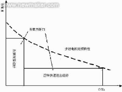 對于織機送經(jīng)機構(gòu),其負(fù)載特點是:當(dāng)步進(jìn)電機正轉(zhuǎn)送出經(jīng)紗時,經(jīng)紗張力不是負(fù)載阻力,而是驅(qū)動力。因此步進(jìn)電機只需輸出較小力矩,克服蝸桿蝸輪自鎖性,織軸即可回轉(zhuǎn)經(jīng)。此時步進(jìn)電機轉(zhuǎn)速可能較高(由緯密定);當(dāng)步進(jìn)電機反轉(zhuǎn)張緊經(jīng)紗時,經(jīng)紗張力是負(fù)載阻力,步進(jìn)電機需輸出較大的驅(qū)動轉(zhuǎn)矩,而此時步進(jìn)電機轉(zhuǎn)速要求較低,步進(jìn)電機的輸出矩頻特性(如圖5虛線所示)正好與其相適應(yīng)。因此、步進(jìn)電機非常適合于這類伺服機構(gòu)低轉(zhuǎn)速大轉(zhuǎn)矩、高轉(zhuǎn)速小轉(zhuǎn)矩和高精度的要求,是織機送經(jīng)機構(gòu)理想的驅(qū)動元件。