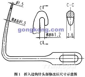 1.1.2.4 對鉤針頭部進行了如圖1所示的處理,鉤針的根部尺寸不變,以保持一定的強度,而緯紗會卷繞到的過渡段從φ2mm改進為φ1.5mm,此時以緯紗的中心計算,繞一圈的周長為L=πD=3.14×2.5=7.85mm,從理論上保證了緯紗不會滑出壓腳;另外,對鉤針頭部適當增大尺寸后,將溝槽增大至1.2mm,并進行適當?shù)膱A整。再經(jīng)過我們的仔細觀察和細心調(diào)節(jié),使折入邊裝置的鉤針、剪刀壓腳和鋼筘、織機開口等配合完美,最后織物光邊的折入穩(wěn)定性和織物邊平直度達到了理想要求。