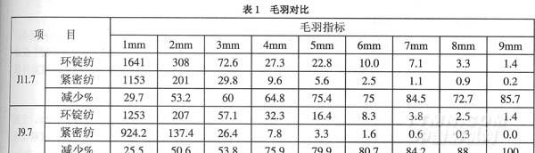 緊密紡紗的質(zhì)量特點就是毛羽少、強力增加。該裝置紡紗情況具體對比如下: